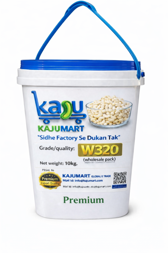 W320 is an internationally recognized White Whole cashew grade. It contains approximately 300–320 whole white kernels per pound. This grade is medium-sized, superior in taste, and suitable for daily consumption, gifting, and commercial use